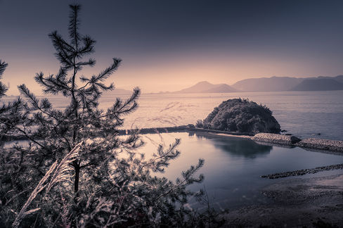 Catching the sakura 568 shinkansen up to Okayama for local train connections to Chayamachi and then Uno for the port. Ferry to the island of Naoshima. Arrived at the lodge to an amazing sunset over the bay.